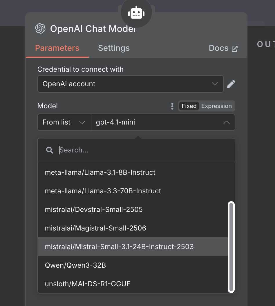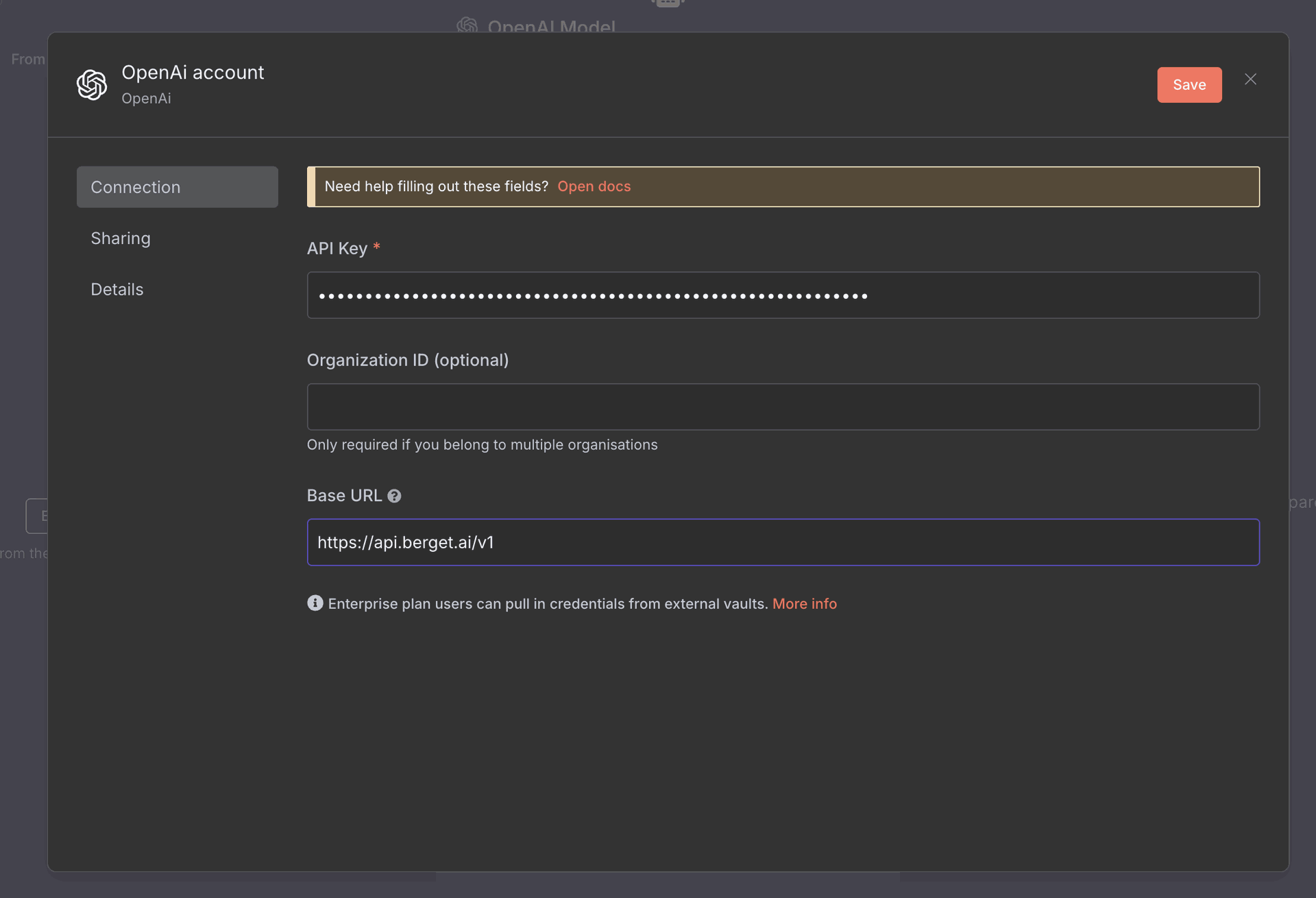 Eftersom Berget AI:s API är kompatibelt med OpenAI så kan du välja den vanliga OpenAI Model: